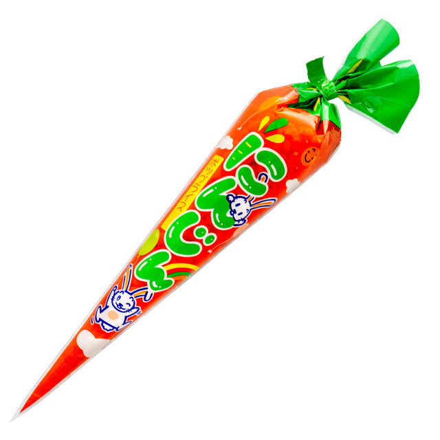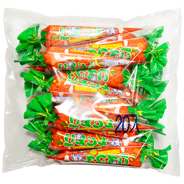 ポン菓子をにんじんの形のフィルム袋に入れたなつかしさを与える商品です。